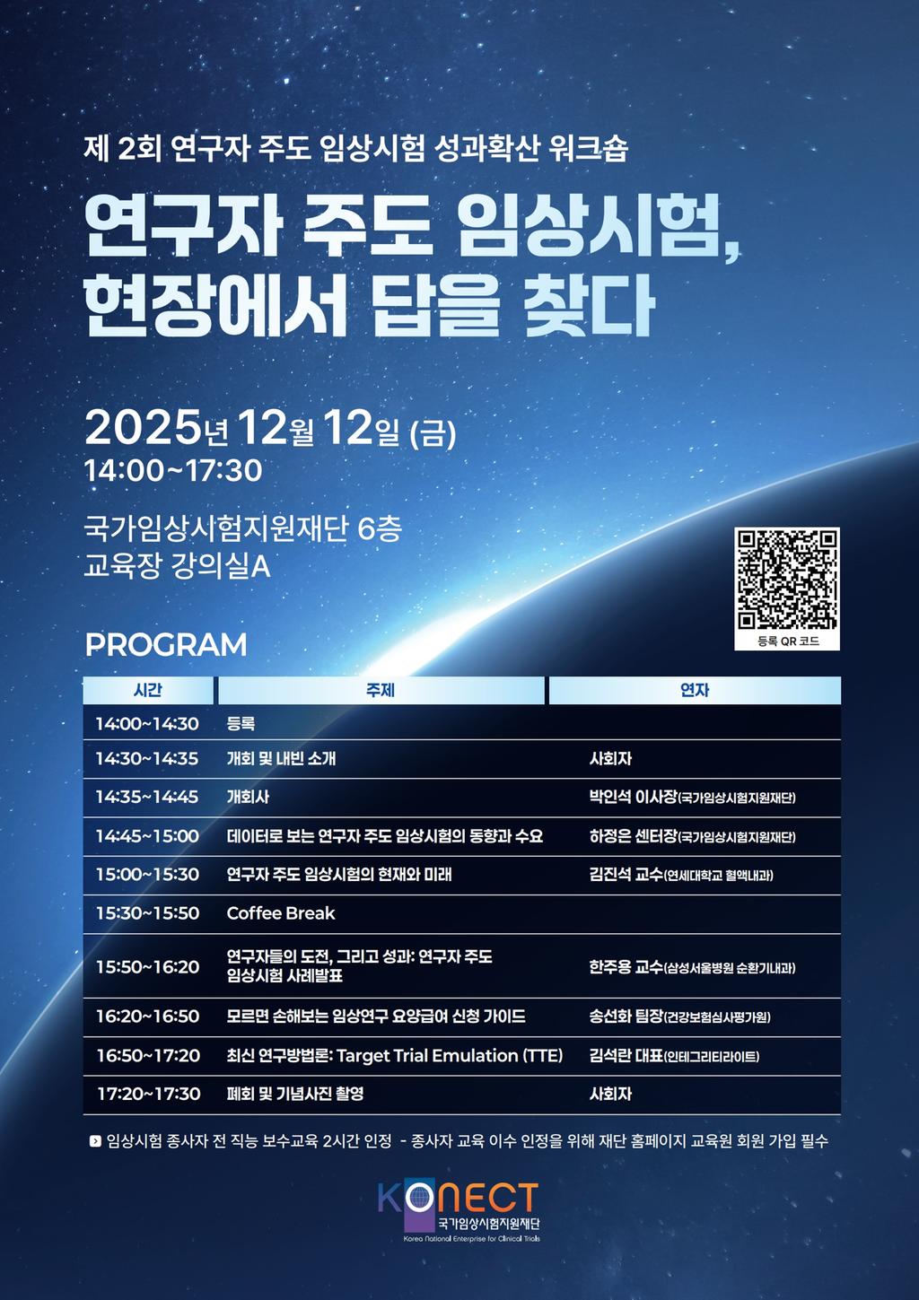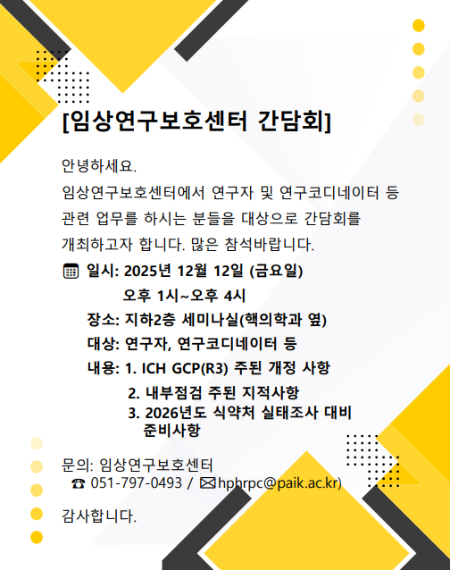 한국임상연구코디네이터회는 변화하는 임상시험 환경을 이해하고, 임상연구코디네이터로서 숙련된 실무 역량을 강화하기 위해 ‘임상시험센터의 지속가능성과 혁신’ 이라는 주제로 공동 심포지엄을 개최합니다. 많은 관심과 참여를 부탁드립니다. 1) 일시 : 2025년 11월 19일(수) 13:25~17:30 2) 장소 : 세브란스병원...