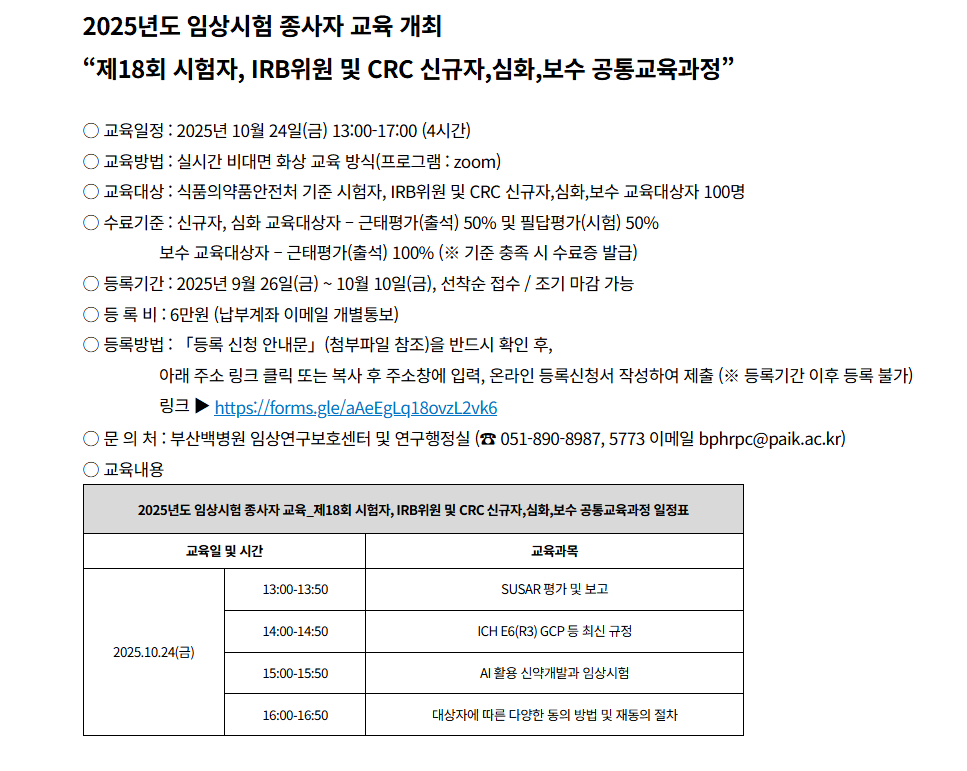 2025년도 임상시험 종사자 교육 개최 “제18회 시험자, IRB위원 및 CRC 신규자,심화,보수 공통교육과정”