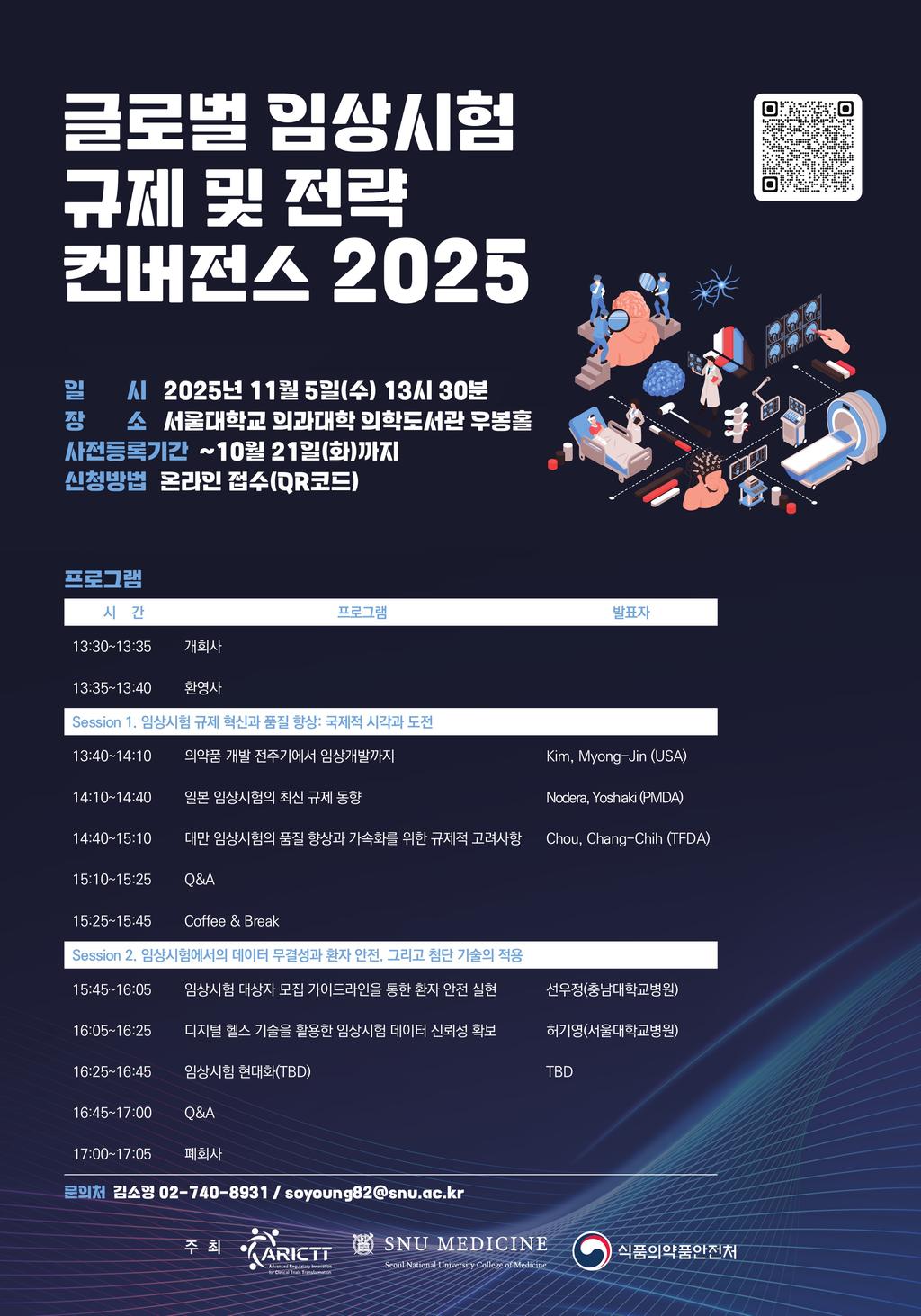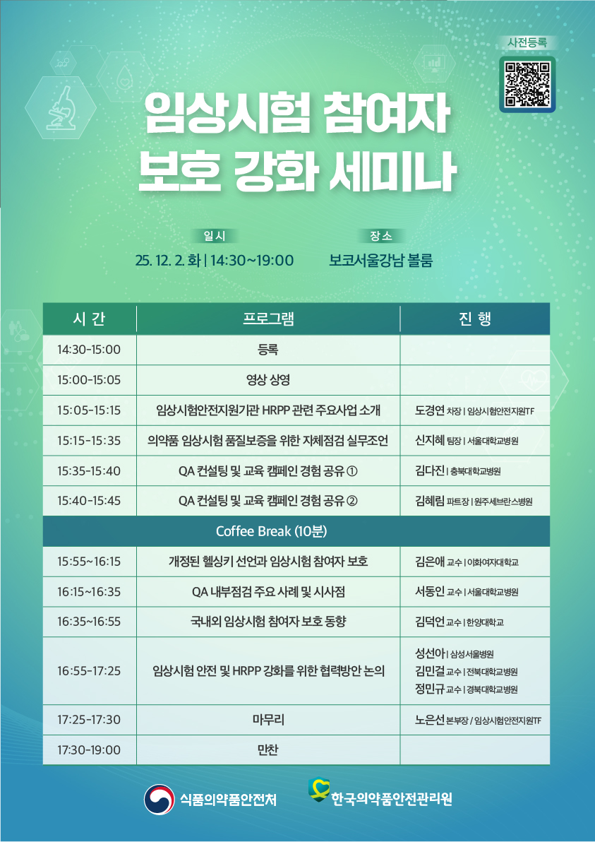 서울대학교 의과대학(책임연구자: 유경상 교수)과 식품의약품안전처 임상정책과가 공동으로 주최하는 이번 심포지엄에 여러분을 초대합니다. 이번 심포지엄은 '임상시험 규제 혁신과 품질 향상: 국제적 시각과 도전을 주제'로, 글로벌 규제기관 전문가들과 국내 임상시험 전문가들이 함께 모여 최신 규제 동향과 혁신 전...