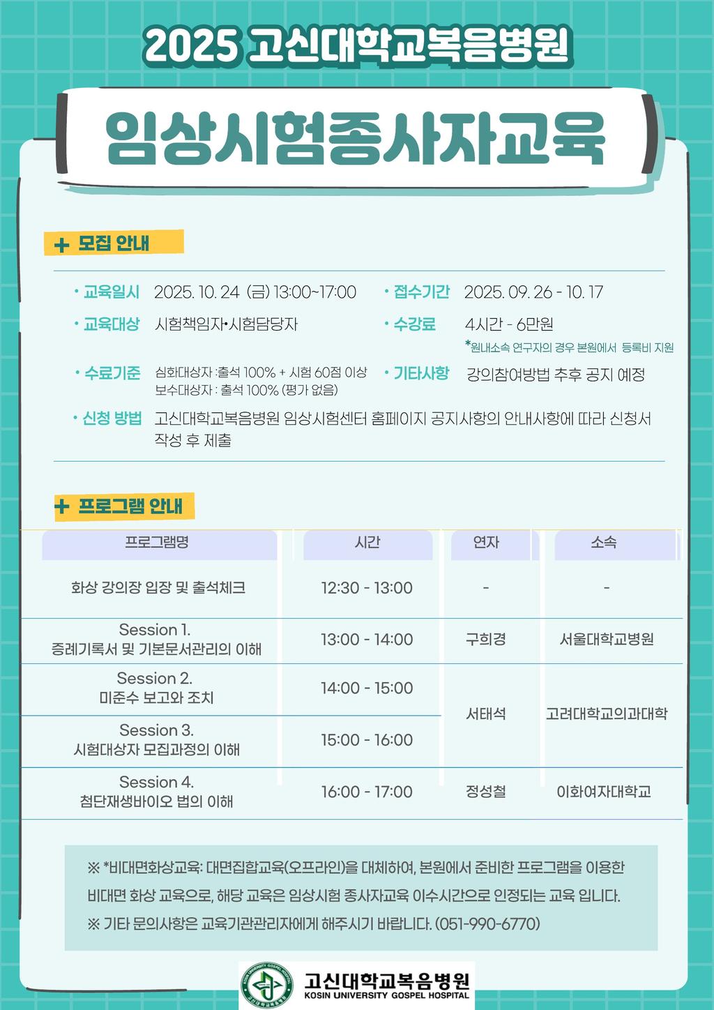 고신대학교복음병원 임상시험 종사자교육(2025년 시험책임자∙시험담당자 심화/보수 통합과정) 교육 안내문 1. 교육일시 : 2025년 10월 24일(금) 13:00~17:00 (4시간) 2. 교육방법 : 실시간 비대면 화상 교육 3. 교육대상 : 임상시험 시험책임자∙시험담당자 4. 수료기준 : 근태평가(출석) 100%, *시험 60점 이상 * ...