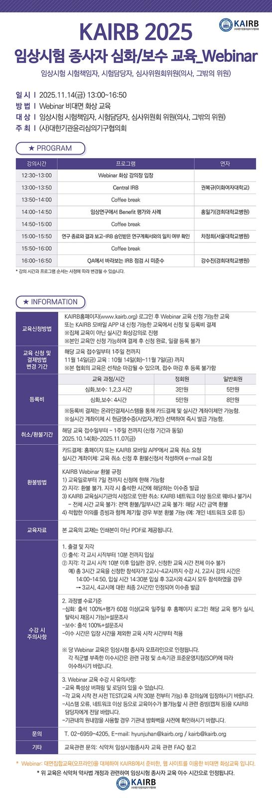 [KAIRB] 11/14(금) 2025 임상시험 종사자 심화/보수 교육 신청 안내_Webinar