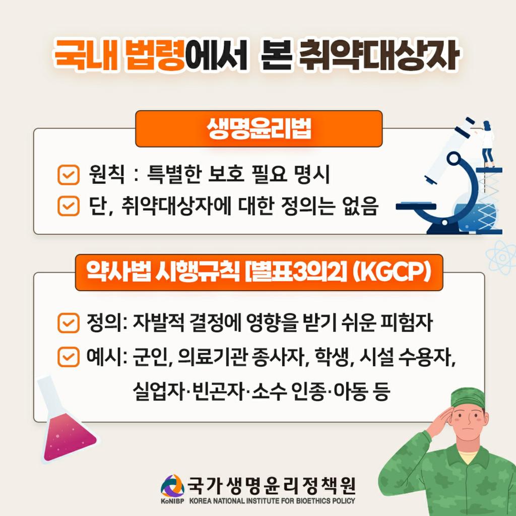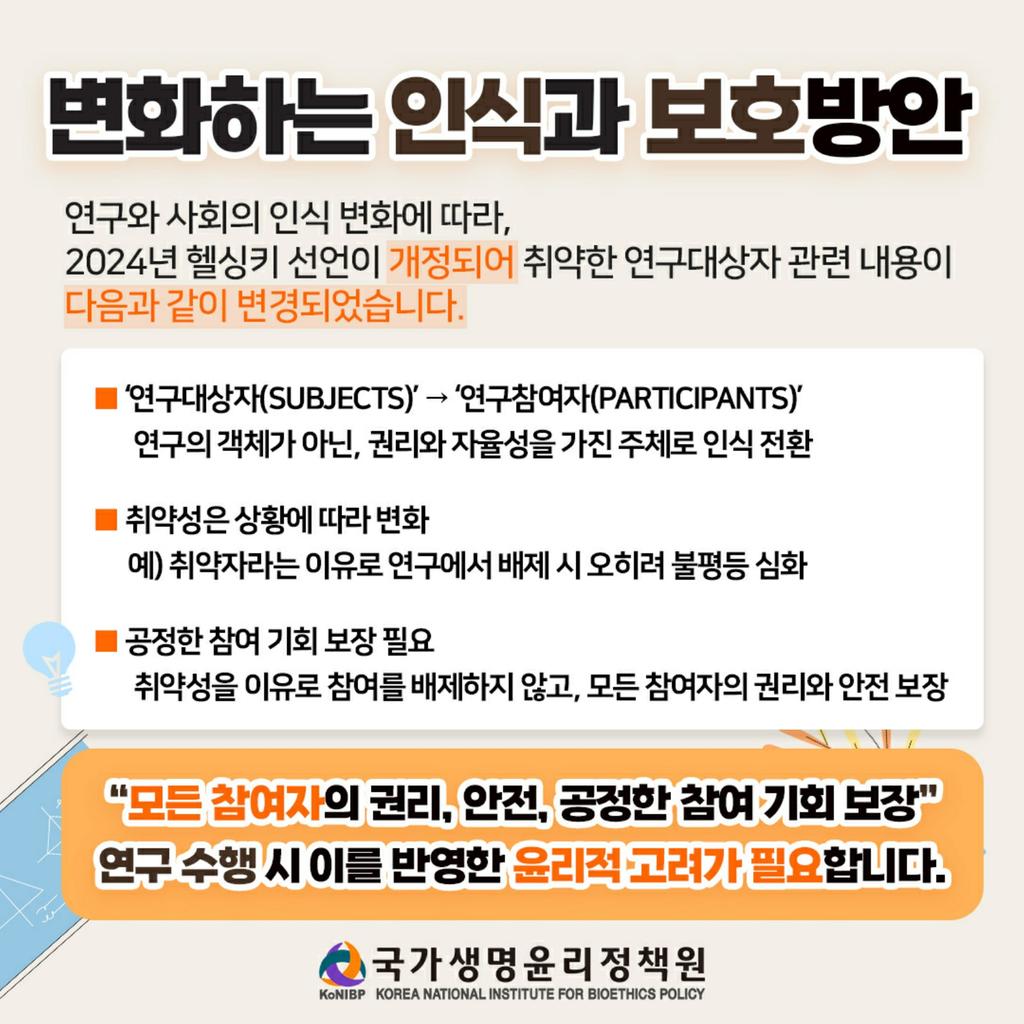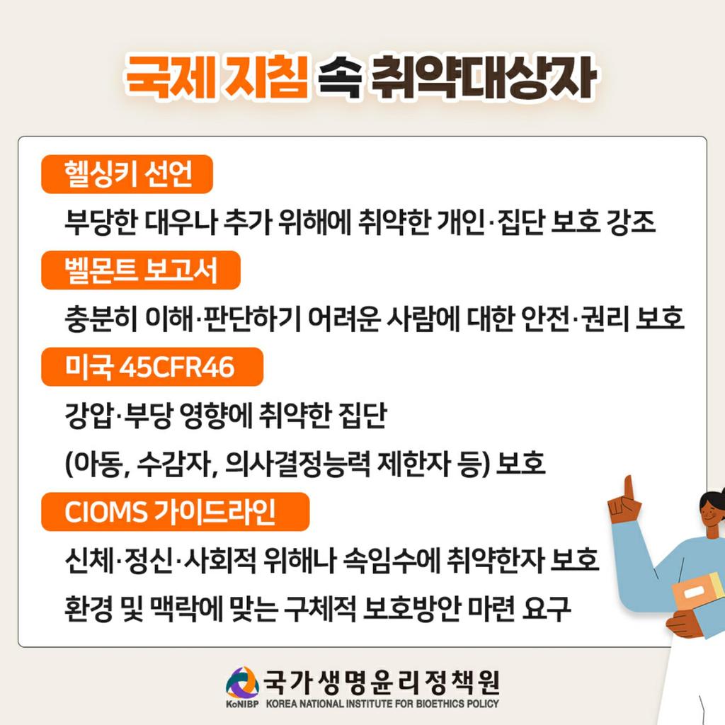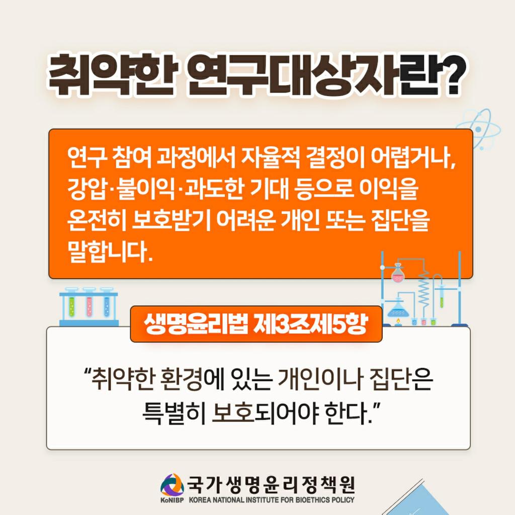 이번 카드뉴스에서는 취약한 연구대상자에 대한 다음 내용들을 확인하실 수 있습니다.